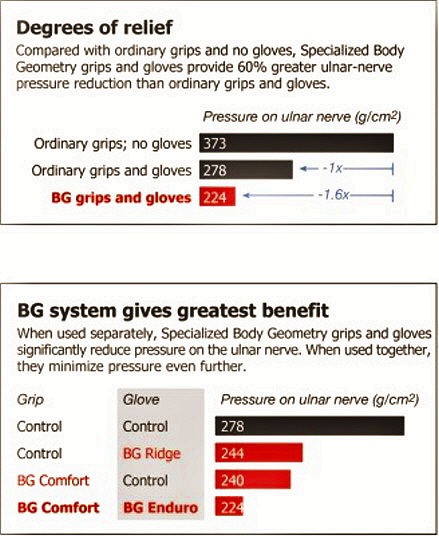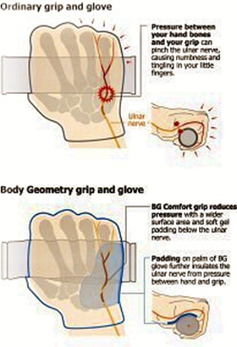 Im Vergleich zu herkömmlichen Griffen und Handschuhen reduzieren Body Geometry - Griffe und - Handschuhe den Druck auf den Ulnar - Nerv um 19%.