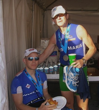 Aus einer Aufholungsjagd wird aber nichts, da auch Theo den ersten Halbmarathon in 1:38 anläuft, für beide eher "suizidal", wenn man dann die Marathonendzeiten von 3:35 und 3:25 betrachtet. Habe mich dann nach Wendepunkt bei km 10.5 nur mehr auf die M50 konzentriert, und bin letztlich mit 9:47 gesamt 4.in der Altersklasse geworden, 4/195, Theo wird in 9:39 gesamt 21/ca.400 in M35. Er hat wirklich einen sensationellen Wettkampf abgeliefert und mich zum 2.Mal in unserer Triathlonkarriere einigheaut (1.Mal Cricket Wintercup), gestern zum 1.Mal im Triathlon.